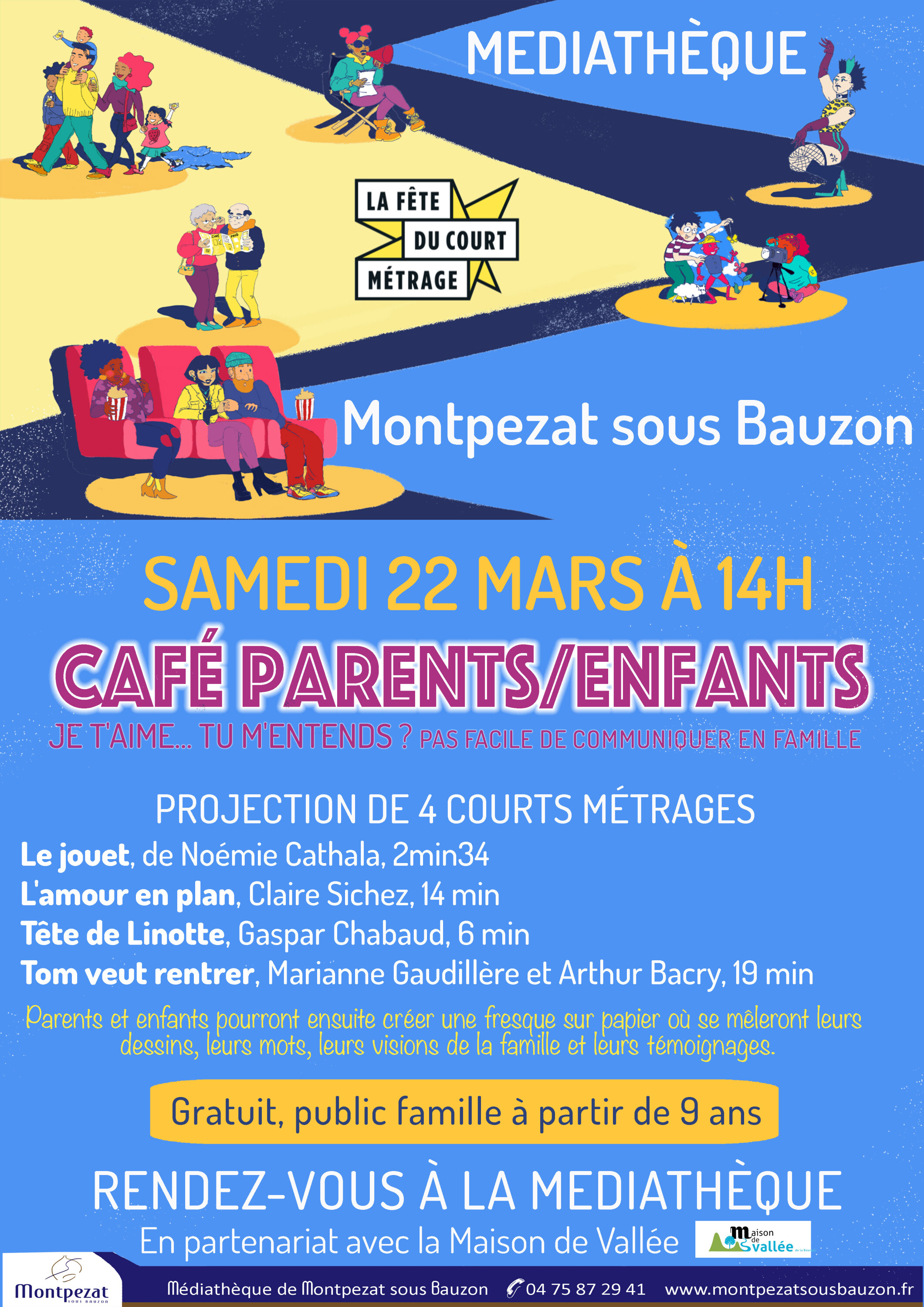 Trois projections ont eu lieu sur la commune de Burzet dont une qui a été proposée par la Bibliothèque en soirée. Les court-métrages projetés au café des familles ont rassemblés 16 personnes.