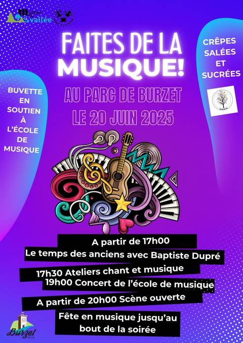 Organisée en partenariat avec la mairie, pour notre "Faites de la musique !" nous vous proposons un programme convivial et qui met comme toujours la musique vivante à l’honneur — de la voix, des instruments… et du partage.