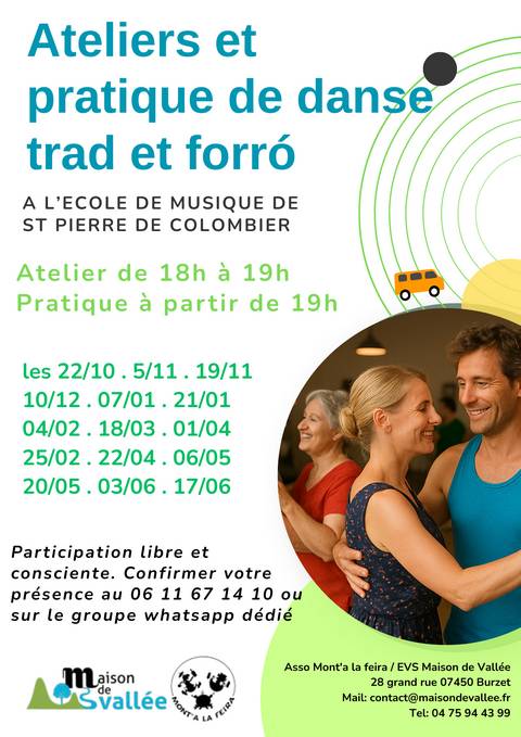 Des ateliers et pratiques de danse trad et de forró ont lieu dans la vallée. Ces ateliers ont lieu de 18h à 19h à prix libre, suivi d’une pratique de danse ouverte à tous·tes à l'école de musique de Saint-Pierre-de-Colombier.