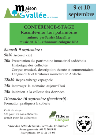 A la suite de la veillée du 3 juin, La Maison de Vallée remet à l'honneur le patrimoine musical ardéchois à l'occasion d'une conférence-stage le samedi 9 et dimanche 10 septembre, à la Salle des Fêtes de Saint-Pierre-de-Colombier.