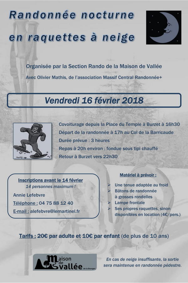 Suite à la journée neige de samedi dernier qui a enchanté tous nos participants, Annie propose une nouvelle randonnée en nocturne le vendredi 16 février 2018, avec Olivier Mathis de l'association Massif Central Randonnées+, à la Barricaude.