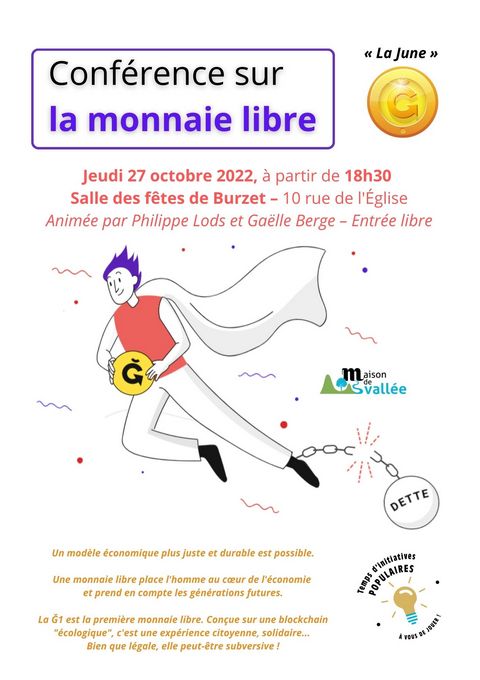Dans le cadre des Temps d'Initiative Populaire, Philippe Lods et Gaëlle Berge vous proposent une conférence sur la monnaie libre ce jeudi 27 octobre 2022 à 18h30 à la salle des fêtes de Burzet.