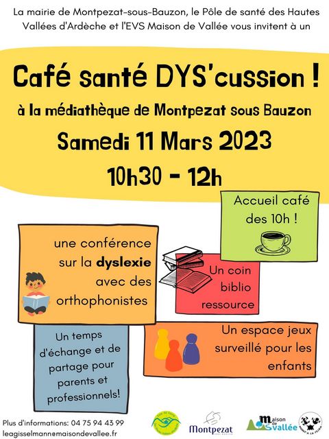 La Maison de Vallée, le Pôle de santé des Hautes Vallées d'Ardèche et la Mairie de Montpezat vous invitent à un Café Santé DYS'cussion à la médiathèque de Montpezat-sous-Bauzon le samedi 11 mars de 10h30 à 12h.