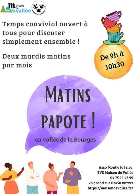 Les prochains "Matins papote" auront lieu les mardis 21 novembre, 5 et 19 décembre 2023.