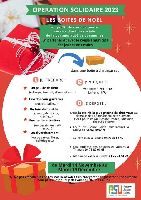 A l'initiative du Service d'Action Sociale de la Communauté de Communes et au profit de "Coup de pouce", cette opération solidaire permet à celles et ceux qui le souhaitent d'apporter chaleur et attention aux personnes qui se trouvent en situation difficile (précarité, isolement, etc...).