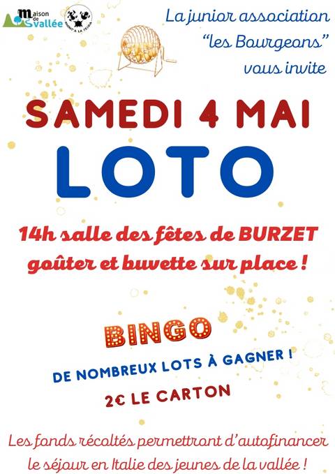 Les jeunes de la Junior Association Les Bourgeons vous invitent à un LOTO le samedi 4 mai 2024 à 15h à la salle des fêtes de Burzet.