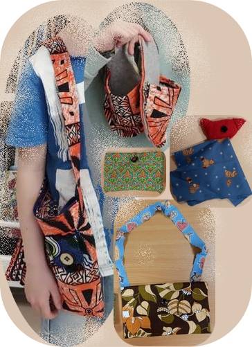 Les participantes aux ateliers ont réalisé divers travaux de couture cet été : tablier et gants de cuisine, housse de matelas et coussins, vêtements et retouches, et plusieurs enfants en vacances sont venus confectionner les sacs, mules et doudou en photo.
