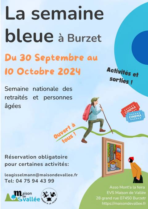 Ne ratez pas l'évènement “La Semaine Bleue” du 1er au 10 octobre 2024 sur Burzet ! Semaine nationale des retraités et personnes âgées, nous proposons des sorties et activités ouvertes à toutes et tous !