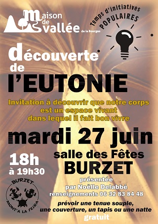 Séance de découverte de l'eutonie par Noëlle Delabbé le 27 juin 2017 à 18h à la Salle des Fêtes de Burzet.