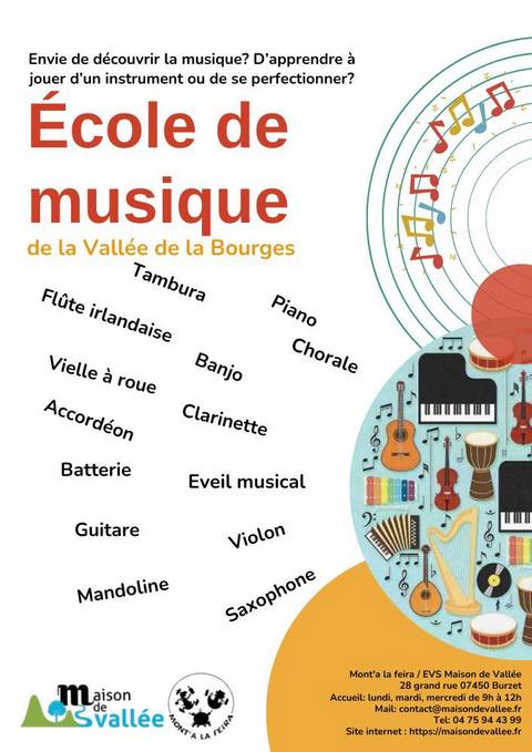 Jérôme Lévêque, basé sur la vallée, continue de proposer des cours de saxo et de clarinette tous niveaux et guitare débutant à Burzet et sur Meyras et Fred Vanucci des cours de violon et de nombreux autres instruments utilisés pour la musique traditionnelle.