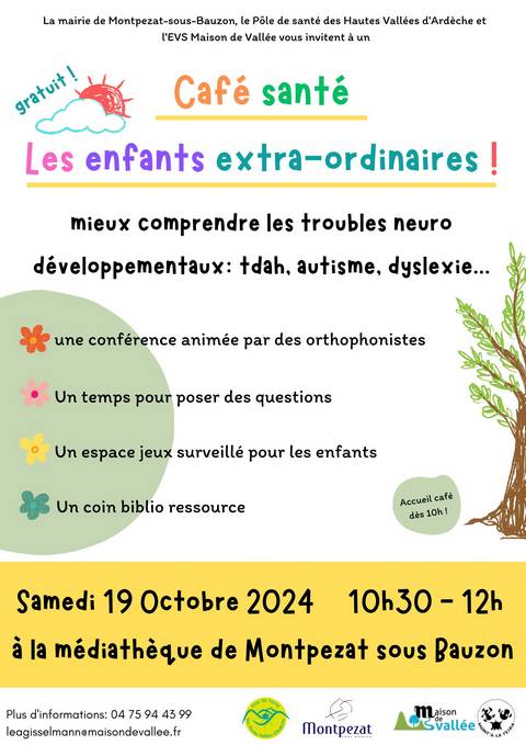 La Maison de Vallée, le Pôle de santé des Hautes Vallées d'Ardèche et la Mairie de Montpezat-sous-Bauzon vous invitent au “Café Santé, les enfants extra-ordinaires, mieux comprendre les troubles neurodéveloppementaux” à la médiathèque de Montpezat-sous-Bauzon le samedi 19 octobre de 10h30 à 12h.