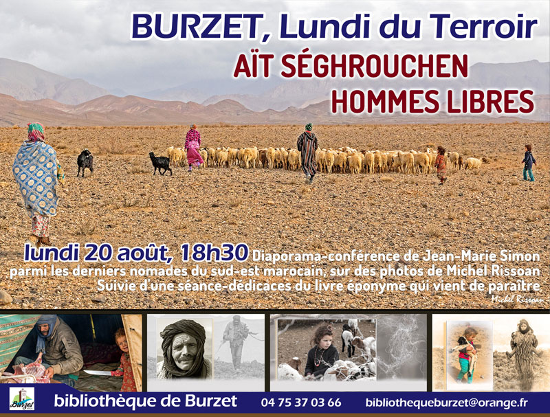 Lundi 20 août, 18h30 dans le parc municipal de Burzet : "Aït Seghrouchen hommes libres" diaporama-conférence de Jean-Marie Simon parmi les derniers nomades du sud-est marocain, sur des photos de Michel Rissoan, suivi d'une séance-dédicaces du livre éponyme qui vient de paraître