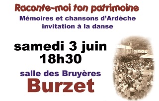 Dans le cadre du projet « Raconte-moi ton patrimoine », la Maison de Vallée organise le samedi 3 juin une soirée veillée sur les chansons anciennes d'Ardèche et des petites histoires en patois. Autour d'une bombine, vous pourrez vous-mêmes si vous le souhaitez pousser la chansonnette ou écouter des chansons oubliées. La soirée sera animée par le groupe Rural Café trio, avec la présence de l'association Tradéridera de Jaujac.